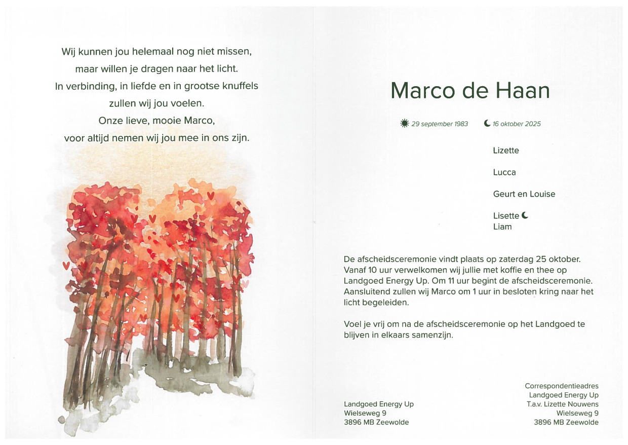 Met grote verslagenheid hebben wij kennisgenomen van het overlijden van Marco de Haan.